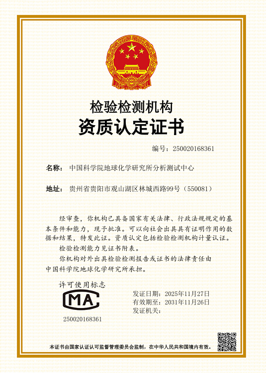 2025年12月8日,中国科学院地球化学研究所分析测试中心成功获得由国家市场监管总局颁发的检验检测机构资质认定(CMA)证书,这标志着分析测试中心在管理体系、技术能力和检测质量等方面均得到权威认证,其出具的检验检测报告将具有法律效力,能够为社会各界提供更具公信力和权威性的技术服务。