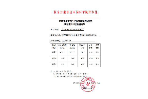 由地球化学研究所公共技术中心牵头,分析测试中心承担,地化所精心组织了6名技术人员参加“国家计量认证中国科学院评审组”在2024年部署的、与地化所仪器相关的全部3项实验室间比对计划。具体是分析测试中心钟颖利用冷原子荧光测汞仪,杨菲和灌瑾利用电感耦合等离子体质谱仪参加了“土壤中总汞和总砷的测定”比对项目;杨秀群利用国产仪器盛瀚D160+参加了“水中氯离子,磷酸根离子的测定”比对项目;月球模拟实验组李瑞和文愿运利用双束扫描电镜参加了“亚微米颗粒粒度测量“比对项目。分析测试工作的技术人员认真按照作业指导书和地化所既有成熟的检测方法程序操作,按时完成了样品的分析测试,向比对计划负责实施单位提交了包括原始记录表、方法程序和检测报告在内的整套技术资料,比对计划的结果全部“满意”。