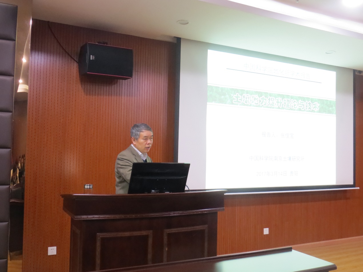 应环境室主任王世杰研究员邀请,中国生态系统观测研究网络(CERN)科学委员会副主任、中国科学院南京土壤研究所张佳宝研究员于3月14日来到地球化学研究所进行学术交流访问,并于3月15日赴普定站进行考察。访问期间,张佳宝研究员参观了环境地球化学国家重点实验室,并于3月14日下午在环境是三楼会议室作了题为“土壤地力提升机理与技术”的学术报告,报告深入浅出地介绍了对我国基础地力变化与新认知、稳定性地力提升研究几点进展、地力定向培育技术发展的相关研究成果,并讨论了地力提升对国家粮食安全战略的推进作用。报告结束后,与会科研人员和研究生与张佳宝研究员进行了广泛的学术交流与讨论。报告会由王世杰研究员主持。