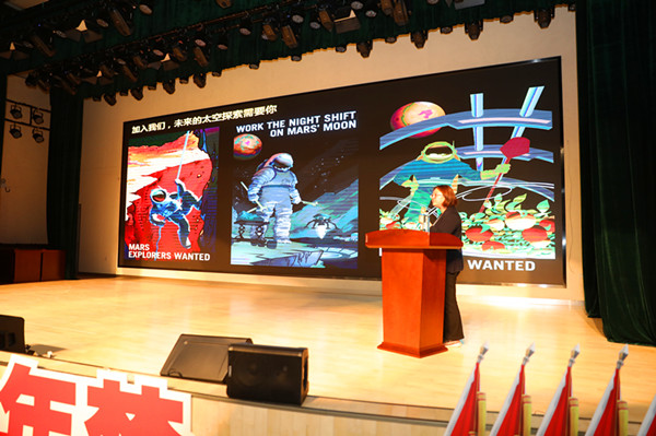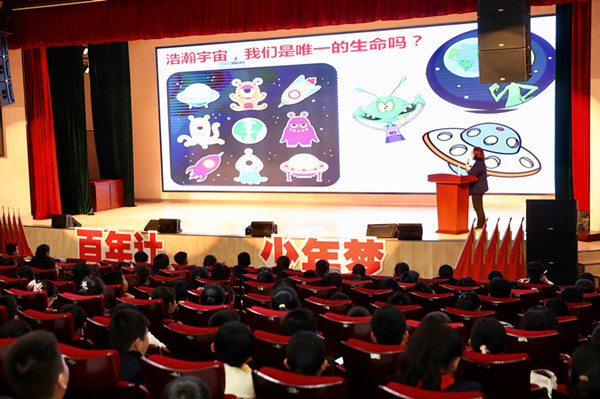 赵宇鴳研究员从“地球的生命从哪里来;太阳系的起源;探索太空——去地球外寻找答案;探索我们的太阳系;国外的火星探测任务;中国的月球和火星探测任务……”等方面,用孩子们喜爱的图片、视频的方式,深入浅出地介绍了太阳系及人类探索火星历程的相关知识。生动的报告吸引了现场每一位同学。他们一边聆听,一边仔细做笔记。在互动环节,同学们围绕着太阳系、宇宙的各种知识提问,赵宇鴳研究员一一进行了真诚、耐心地解答,并鼓励他们努力学习文化知识,发展自己的兴趣,将来为国家的科技发展做贡献。