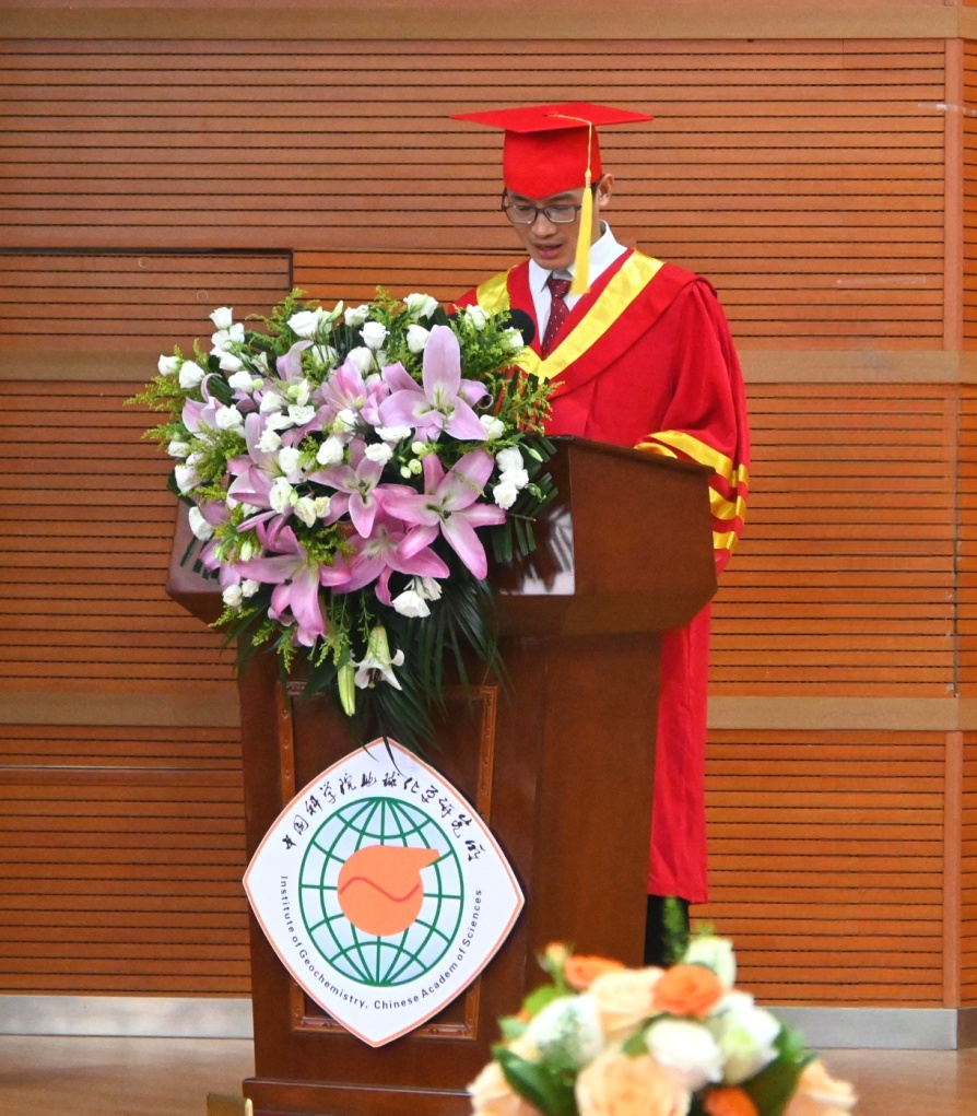 何宇研究员作为导师代表发言,他首先向毕业生们表示祝贺,同时结合自己的经历,给毕业生们送去殷殷嘱托。强调新时代为个人发展提供了良好环境,鼓励毕业生们放平心态、专注发展。同时,强调地球科学的重要性,鼓励毕业生们自强不息、厚德载物,并祝福他们勇敢追梦,成就辉煌未来。