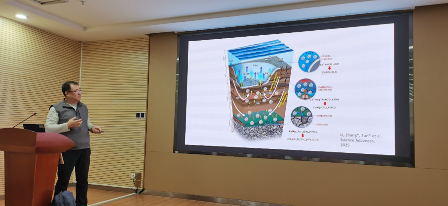 报告围绕俯冲起始机制和俯冲带碳循环两大前沿主题展开。在第一部分,孙卫东研究员系统介绍了其团队近期在西太平洋俯冲起始研究方面取得的系列重要进展,重点分享了在穆绍海沟区域的最新发现:首次识别出一个规模宏大的板内富氢热液系统 “昆仑热液筒群”。该成果揭示了蛇纹石化过程驱动深海氢气大规模释放与聚集的新机制,对理解地球深部物质循环、深海极端环境生态系统及潜在资源形成具有重要科学意义。第二部分,孙卫东研究员聚焦于俯冲带碳循环这一前沿主题。指出俯冲作用对深部碳迁移与地表碳循环的影响可能比传统认识的构造隆升更为关键,为重新理解地质历史时期大气CO₂浓度演变提供了新的理论视角。