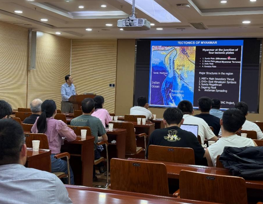 Myint教授首先系统解析了缅甸的构造单元划分和地质背景:该区位于青藏高原东南缘,东部为Sibumasu板块,西部为西缅地块,并受古特提斯与新特提斯等多期构造演化叠加影响。随后,Myint教授介绍了横跨缅甸全境的浅成低温热液型、矽卡岩型、造山型等多种金矿床类型,并选取代表性矿床展开详细讲解。最后,Tin与参会科研人员就缅甸构造单元与邻区关联性、各地质单元基底性质、典型金矿床成因机制等方面展开讨论,现场互动热烈。