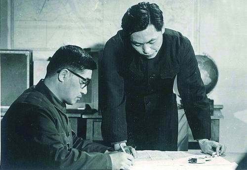 1976年,考察吉林陨石雨期间欧阳自远(右)与天文学家卞德培讨论考察方案。