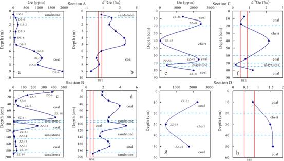 4 临沧超大型锗矿床含锗煤层锗含量与δ74Ge垂向变化图解