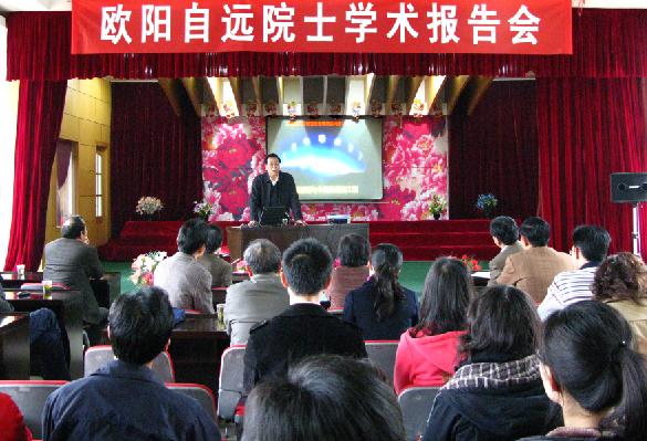2010年3月31日,嫦娥绕月探测工程首席科学家欧阳自远院士在中国科学院地球化学研究所工会大厅给全所科技人员作了题为《深空探测与中国嫦娥工程》的学术报告,胡瑞忠所长主持了报告会。在两个多小时的报告中,欧阳自远院士深入浅出地介绍了国内外深空探测的历史背景、探测历程和取得的科研成果。月球和火星是距离地球最近的两个天体,是世界各国开展深空探测的首要目标。从上世纪五十年代开始,美国和前苏联的太空竞赛掀起了月球探测的第一轮热潮;七十年代后期一直到九十年代,月球探测进入相对平静期;1994年美国的Clementine月球探测器在月球极区发现可能存在水的证据,引发了新一轮以月球资源开发利用为目标的探测热潮,NASA、ESA、日本、印度等先后提出了自己的月球探测计划。在这一国际背景下,我国也着手实施月球探测工程,从无人探测的绕(绕月探测)、落(软着陆)、回(采样返回)到最后建立月球基地,计划分布实施。目前我国已成功发射了嫦娥一号卫星,成功进行了对月球的整体性探测,获得了大量科学数据,圆满完成了嫦娥一期的探测任务。