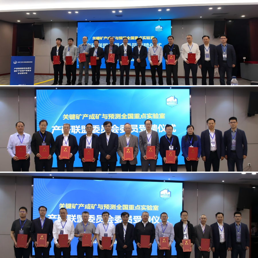 关键矿产成矿与预测全国重点实验室产研联盟委员会由地勘单位总工程师、首席科学家、大型矿山企业技术负责人、关键矿产成矿与预测全国重点实验室主任和学科带头人等共同组成。来自地勘单位、大型矿山企业、关键矿产成矿与预测全国重点实验室的领导、专家和科研骨干共同见证了关键矿产产研联盟委员会成立。胡瑞忠院士、陈敬安书记和赵军红主任共同为到场的关键矿产产研联盟委员会委员颁发聘书。