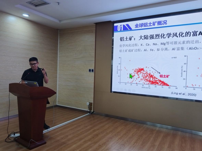 凌坤跃作了题为“中国喀斯特型铝土矿-黏土型锂矿共生机制”的报告。报告首先介绍了中国喀斯特型铝土矿及伴生锂资源的特征,喀斯特型铝土矿的成因模型存在较大的争议,铝与锂的共生机制也不清楚。接着,详细介绍了通过成矿模拟实验及铁同位素来示踪铝土矿成矿过程的研究成果,通过大量的地球化学和微区原位分析,探讨了铝土矿共生的黏土型锂矿中锂的赋存状态及富集机制,探究了锂、铝的共生机制的并建立了成矿模式,为理解锂和铝的地球化学性质及富集机理提供了新的认识。