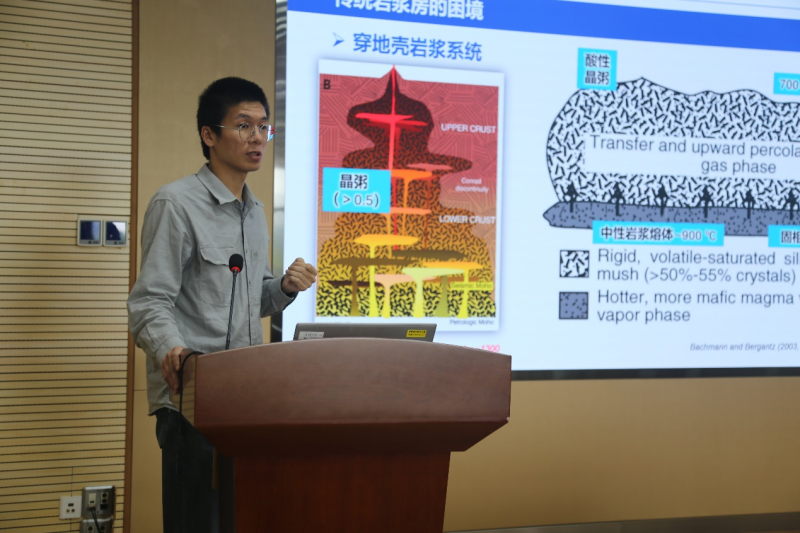 尹烁副研究员作了题为“长英质岩浆成铁矿之谜”的报告。报告首先介绍了当前分离结晶作用的历史局限与传统岩浆岩成矿专属性的现实困境,引出花岗岩侵入岩成矿铁矿的科学难题。紧接着,以花岗闪长岩钾长石巨晶为切入口,从时间、结晶度、挥发份、物理化学参数等多个维度精细刻画了成矿岩浆岩的动力学过程,阐明晶粥活化引起的岩浆内部对流叠加榍石交代钛铁矿的动态过程是成矿流体出溶的触发机制。最后,尹烁副研究员重点强调了碳酸盐的混染是维持榍石稳定/抑制钛铁矿结晶的关键因素,解释了为什么长英质岩浆成铁矿往往是矽卡岩型,提供了重要的找矿勘查标志。