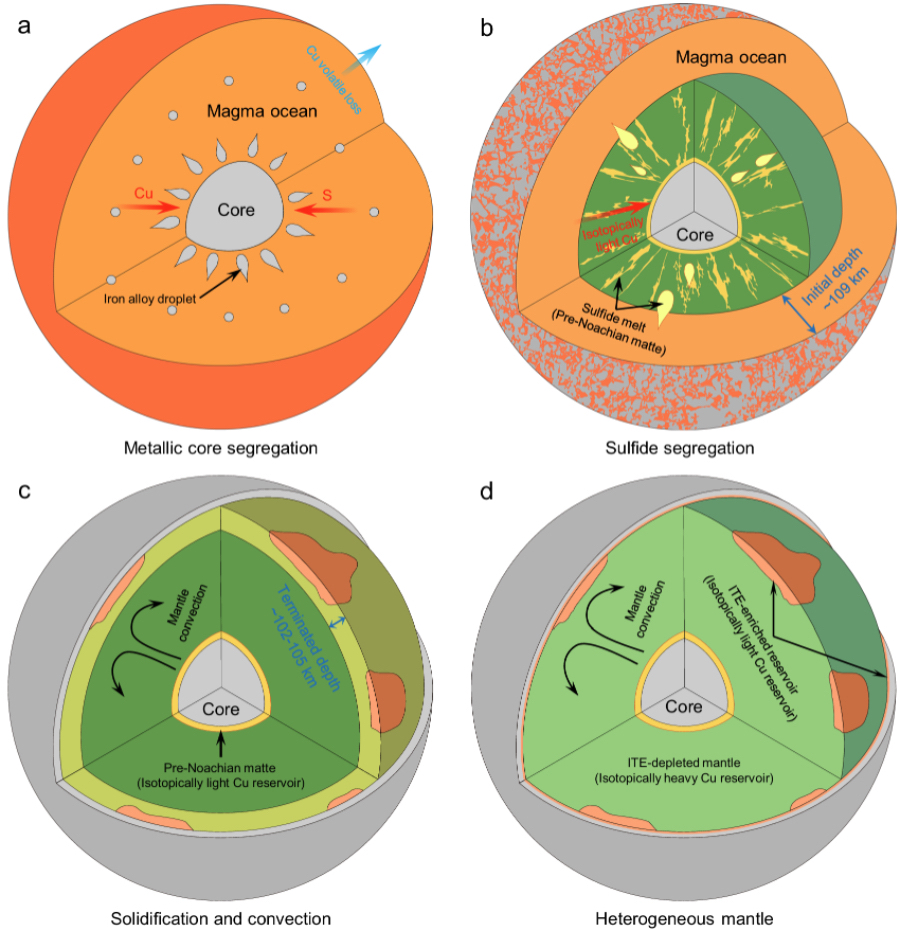 该研究构建了一个两阶段核心形成模型。该模型以火星的初始球粒陨石组成(building blocks)为基础,首先模拟了金属核分离过程中硫与铜的分配行为及铜同位素分馏,并借助中等挥发性元素钾来评估气化损失对铜含量与同位素组成的影响。随后,利用热力学计算软件alphaMELTS 1.9模拟火星岩浆洋结晶过程中的主量元素演化,再结合硫饱和时的硫含量(SCSS)的参数化模型,确定了硫化物开始析出的时机。计算结果表明,当岩浆洋结晶度达到约89%时,残余熔体进入硫饱和状态,硫化物熔体开始形成并向核部迁移。然而,铜同位素制约显示,在残余岩浆洋的深度浅于约102–105 km时,较低的温度抑制了硫化物熔体的下渗。尽管在残余熔体更浅时形成的硫化物熔体仍可能向下运移,却无法进入地核,而是被固存于火星的硅酸盐幔中。这一机制导致火星幔相对富集重的铜同位素,而随后较弱的地幔对流则促成了不均一火星幔的形成(图1)。