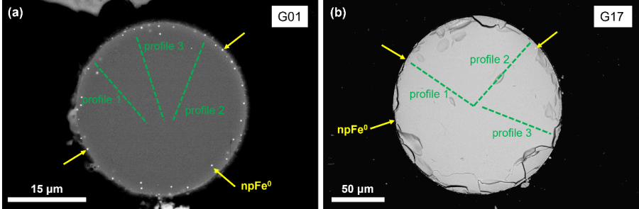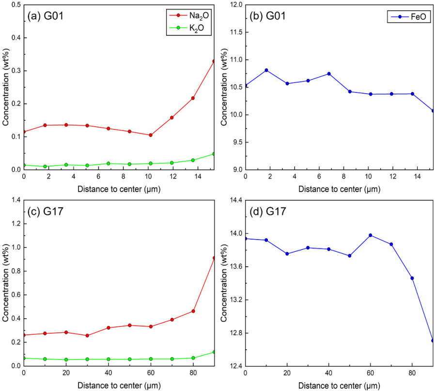 为精准刻画玻璃珠内部的化学变化,研究团队对G01和G17两颗玻璃珠进行了从中心到边缘的高精度元素剖面分析。结果显示,碱金属(Na2O、K2O)从中心向边缘呈现显著的富集趋势:以G01为例,Na2O含量从中心的0.10 wt%增至边缘的0.31 wt%,K2O从0.015 wt%增至0.047 wt%;G17的变化更为显著,Na2O从0.28 wt%增至0.88 wt%,K2O从0.066 wt%增至0.125 wt%(图2)。与之相反,氧化亚铁(FeO)含量从中心向边缘呈现明显降低趋势,G01中FeO从10.51 wt%降至10.04 wt%,G17中则从13.87 wt%降至12.84 wt%(图2)。与FeO的消耗相对应,玻璃珠边缘大量出现纳米级金属铁颗粒。这种“碱金属富集—铁消耗—金属铁生成”的空间耦合关系,构成了一个完整的化学“指纹”,强烈暗示着玻璃珠边缘曾经历过一个特殊的氧化还原过程。