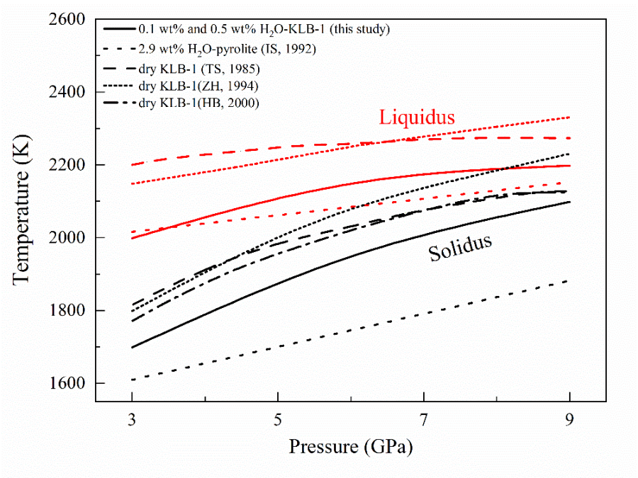 图1. 含水橄榄岩 KLB-1的液相线(红色实线)与固相线(黑色实线)。