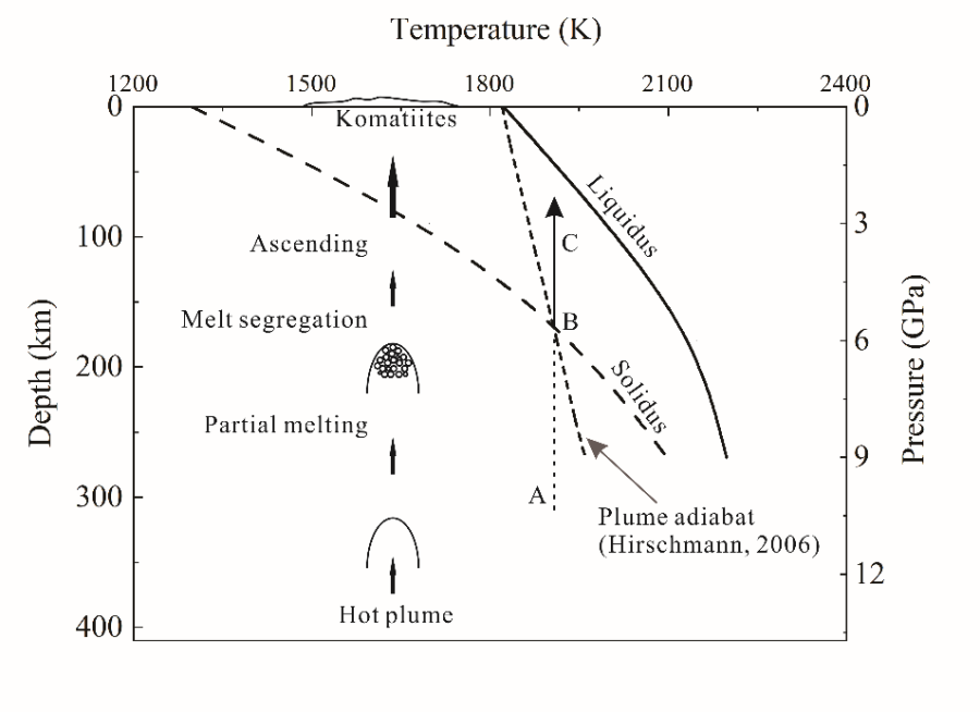 图2. 科马提岩岩浆生成模型。上升的地幔柱在减压过程中产生热量(路径A-B),科马提岩岩浆可沿约180 km深处的橄榄岩固相线生成。科马提质部分熔体形成后,从源区分离(B)并上升至地表(路径B–C)。