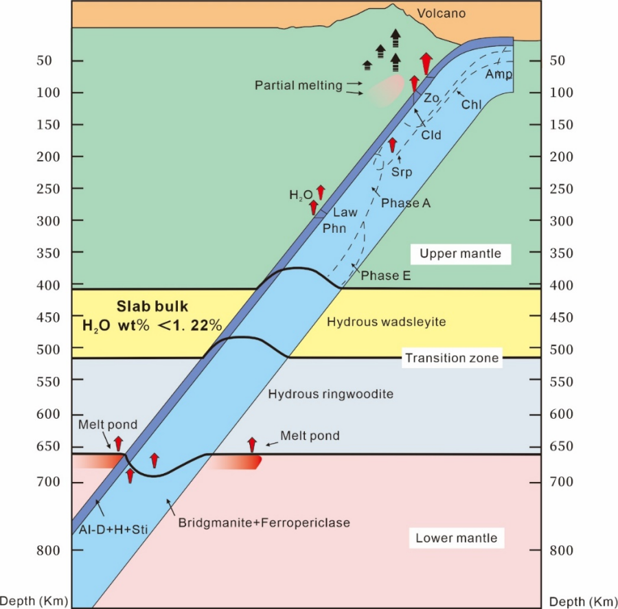 图1. 水在地球内部分布示意图。在俯冲板块中含水矿物的稳定性模拟(H₂O含量低于临界点1.22 wt%)。在300公里深处,几乎所有矿物都完全脱水。A相可能是水的主要载体,可下潜至400公里深度,在局部富水区域可能含有少量E相。在地幔过渡带,水主要储存在含水的瓦兹利石和林伍德石中。在660公里处,林伍德石发生分解,释放出水并形成含水熔体层。只有高热稳定性的相,例如富铝的D相、H相和含水的斯石英,可以将有限的水输送到下地幔。注:Zo:黝帘石,Amp:角闪石,Chl:绿泥石,Srp:蛇纹石,Hy-Wd:含水瓦兹利石,Hy-Rw:含水林伍德石,H-Sti:含水斯石英,Al-D:富铝D相,H:H相。