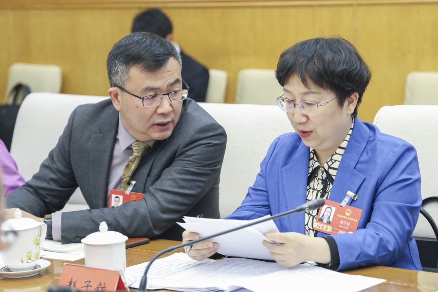 3月9日,在十四届全国人大四次会议贵州团代表小组会议上,全国人大代表、贵州财经大学副校长赵子铱(右)同全国人大代表万泉围绕教育话题进行交流。今年全国两会期间,赵子铱建议持续深化高水平大学帮扶西部高校学科建设,全面支持受援地区高等教育高质量发展,夯实学科帮扶的支撑条件。此外,她还建议加大支持教育对外开放力度,提升中国—东盟教育交流周平台能级,扩大合作品牌影响力。